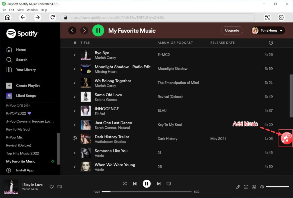 Browse your library and find the songs you like. You can directly open an individual track, podcast, entire playlist or album. And add the items into the converting list by clicking the “+” icon in the right side.