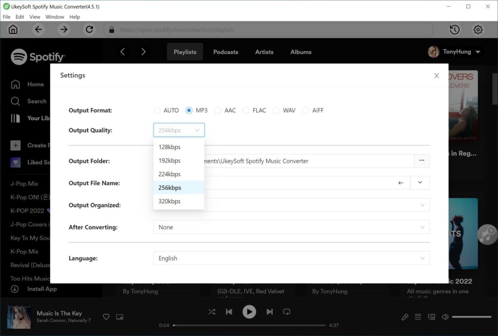 UkeySoft Spotify Music Converter output Spotify songs to M4A by default. You can click the “Gear” icon to access the settings window. Then, select your desired output format (AUTO M4A, MP3, AAC, WAV, FLAC, or AIFF).